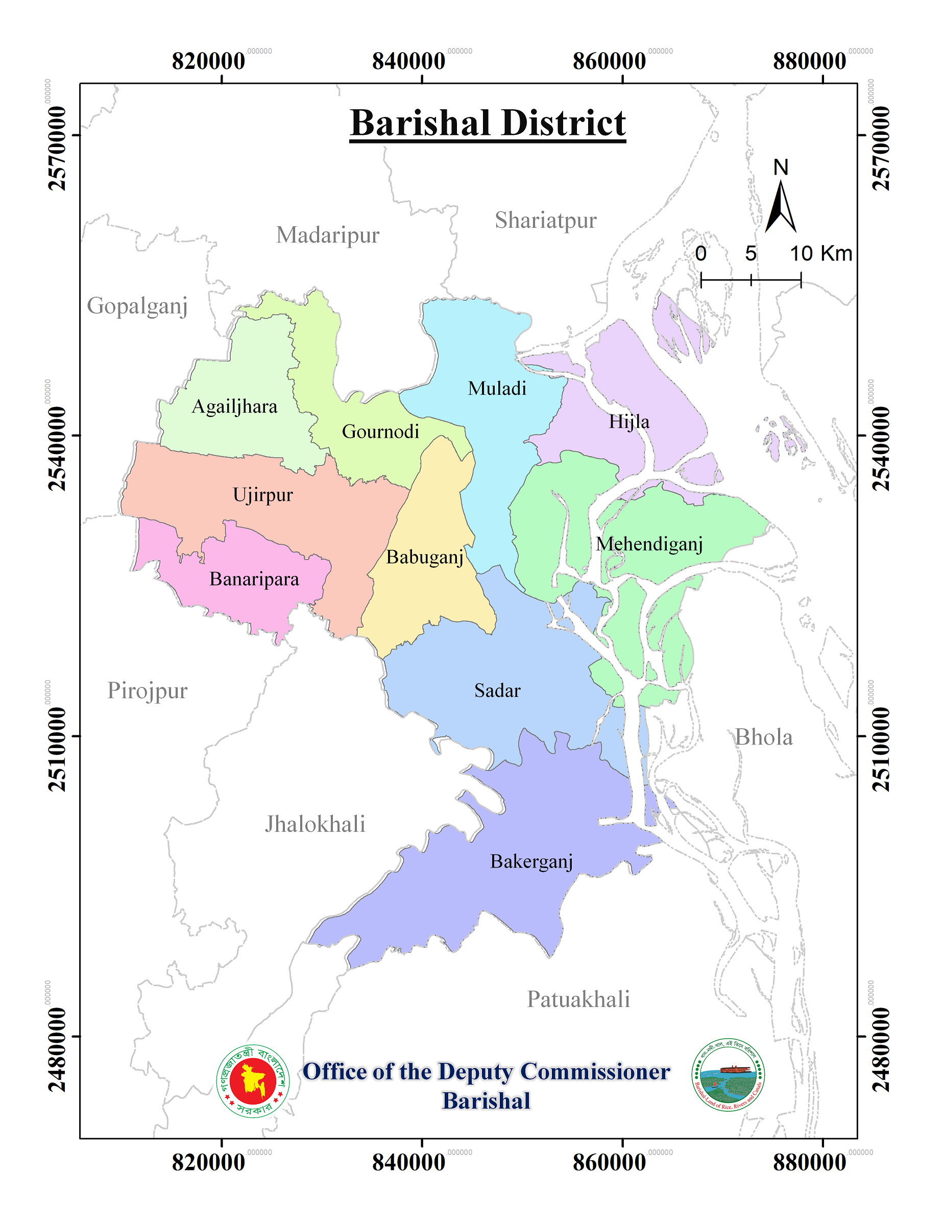 | সীমানা | বরিশাল জেলার উত্তরে চাঁদপুর, মাদারীপুর এবং শরীয়তপুর জেলা; দক্ষিণে ঝালকাঠি, বরগুনা এবং পটুয়াখালী জেলা; পূর্বে লক্ষ্মীপুর জেলা ও মেঘনা নদী এবং পশ্চিমে পিরোজপুর, ঝালকাঠি ও গোপালগঞ্জ জেলা। | ||